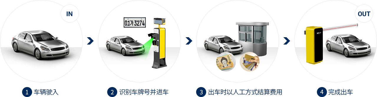 该系统在进车或出车时,通过车牌号识别器识别相应车牌号,出车时仅通过号码识别数据在电子屏上显示停车费用,在人工收费亭用现金、信用卡、交通卡等多种支付方式结算后出车。
